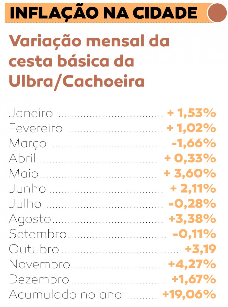 O valor do cesto básico em Cachoeira do Sul registrou em 2015 uma alta de 19,06% em relação a 2014, um índice bem superior ao da transição de 2013 para 2014, que ficou em 10,78%. O balanço vem da pesquisa de preços realizada mensalmente na cidade pelo curso de Administração do campus de Cachoeira do Sul da Universidade Luterana do Brasil. Em 2015, a inflação ficou em 10,67%, pelo Índice Nacional de Preços ao Consumidor Amplo (IPCA-IBGE), o indicador oficial do governo federal para aferição das metas inflacionárias.