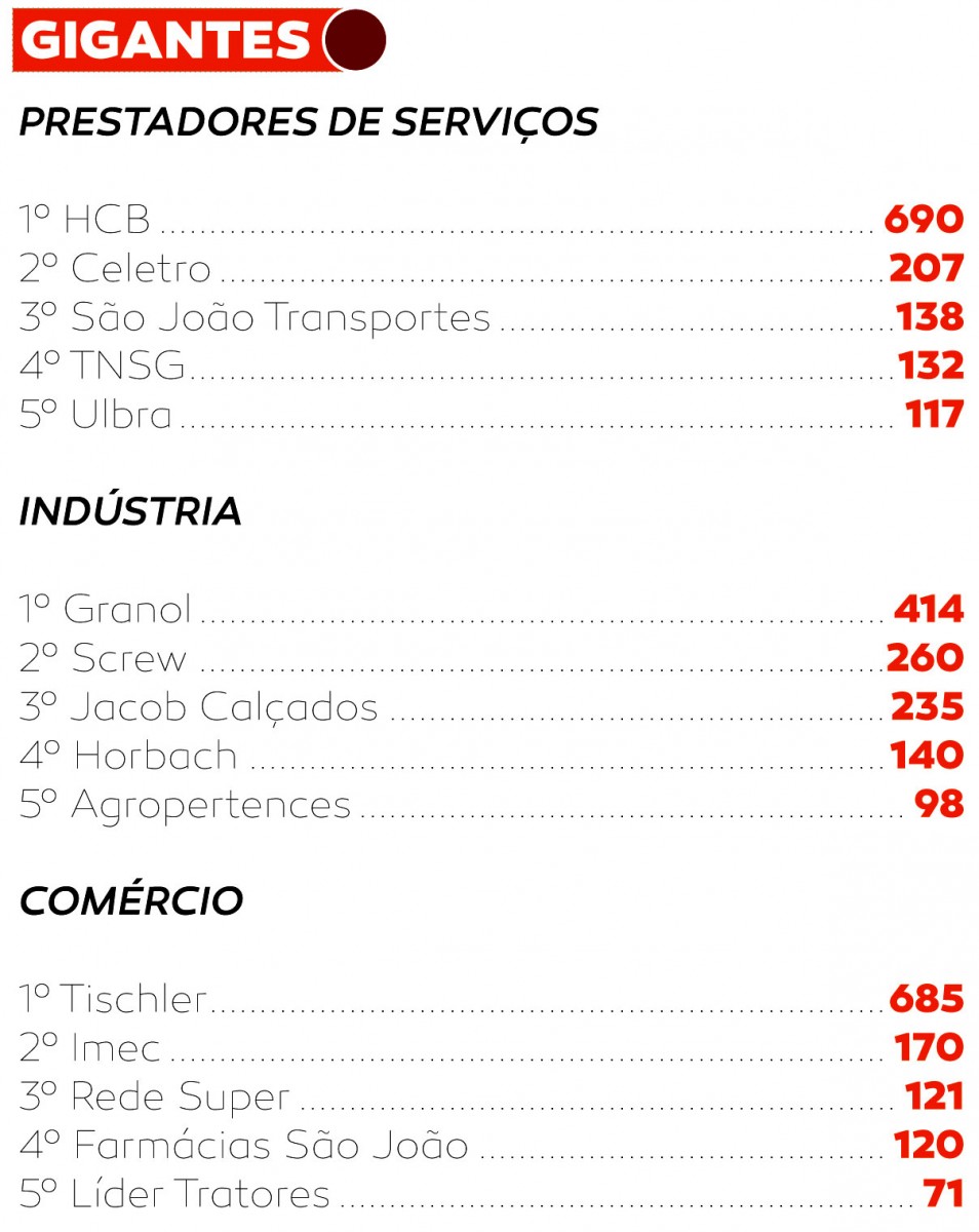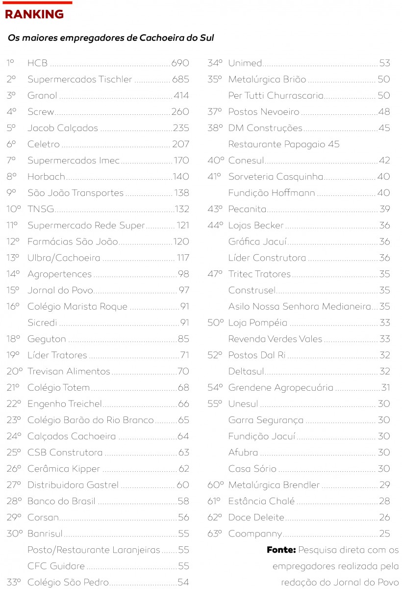 Diversificado. Assim pode ser considerado o grupo dos 10 gigantes do emprego em Cachoeira do Sul. Entre os grandes empregadores da cidade estão quatro empresas prestadoras de serviços, quatro indústrias e dois estabelecimentos comerciais. E entre as potências do mercado de trabalho, sete são cachoeirenses, empresas que nasceram na Capital Nacional do Arroz. Juntos, os gigantes geram 3.071 empregos na cidade, o que corresponde a 52% das vagas ocupadas atualmente nos 63 grandes empregadores de Cachoeira: 5.897.