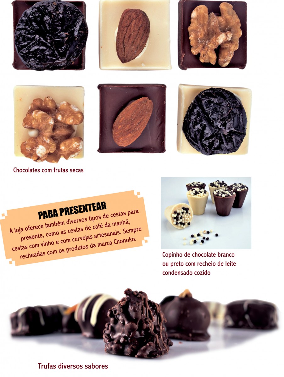 Na linha de chocolates, a Chonoko comercializa chocolate ao leite, chocolate branco, chocolate 70% cacau, chocolate meio amargo, chocolate sem lactose e chocolates diet.