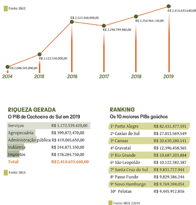 A nova versão do estudo do Instituto Brasileiro de Geografia e Estatística (IBGE), divulgado no fim de 2021, apontou que, em 2019, a diferença entre os custos e a venda de toda a produção da agropecuária, da indústria e da prestação de serviços de Cachoeira do Sul atingiu R$ 2.414.633.640,00. No ano anterior, o montante foi de R$ 2.354.964.140,00.