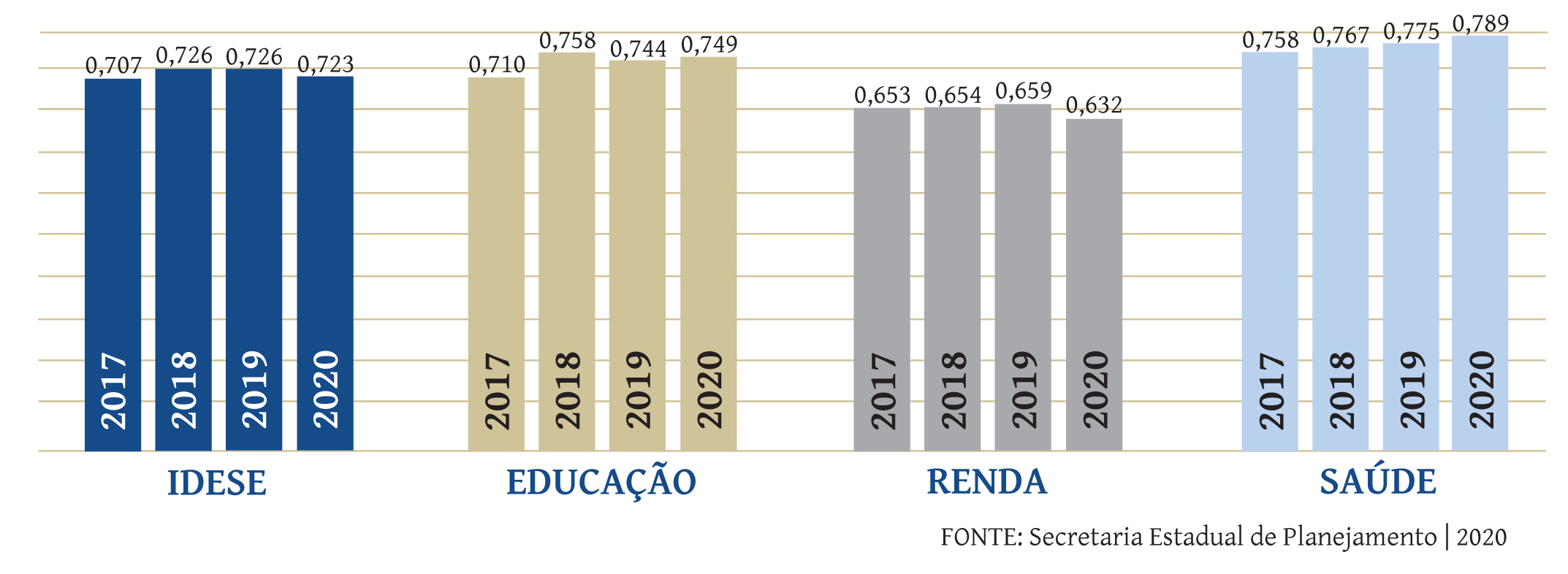 O Idese considera dados como taxas de reprovação e notas de alunos em testes aplicados pelo governo federal nos estudantes de escolas públicas, o produto interno bruto (PIB), a criação de vagas no mercado de trabalho e taxas de mortalidade infantil e materna e de crianças nascidas com baixo peso. A queda no Idese referente a 2020 foi registrada em praticamente todo o Rio Grande do Sul. O índice médio do estado ficou em 0,768, uma baixa de 1,4% com relação ao 0,776 de 2019.
