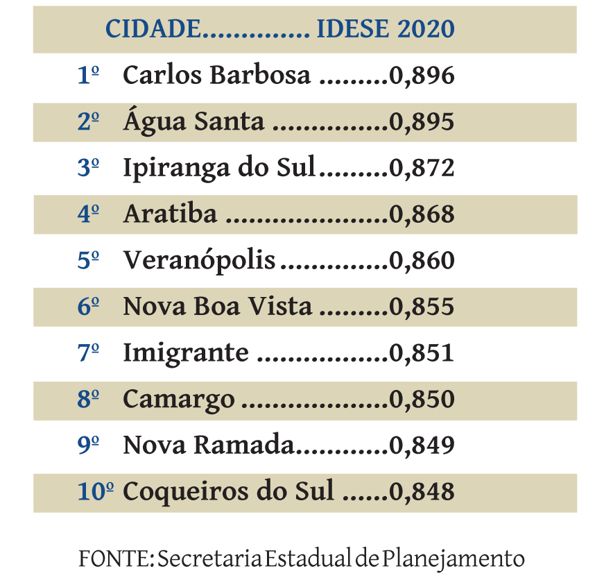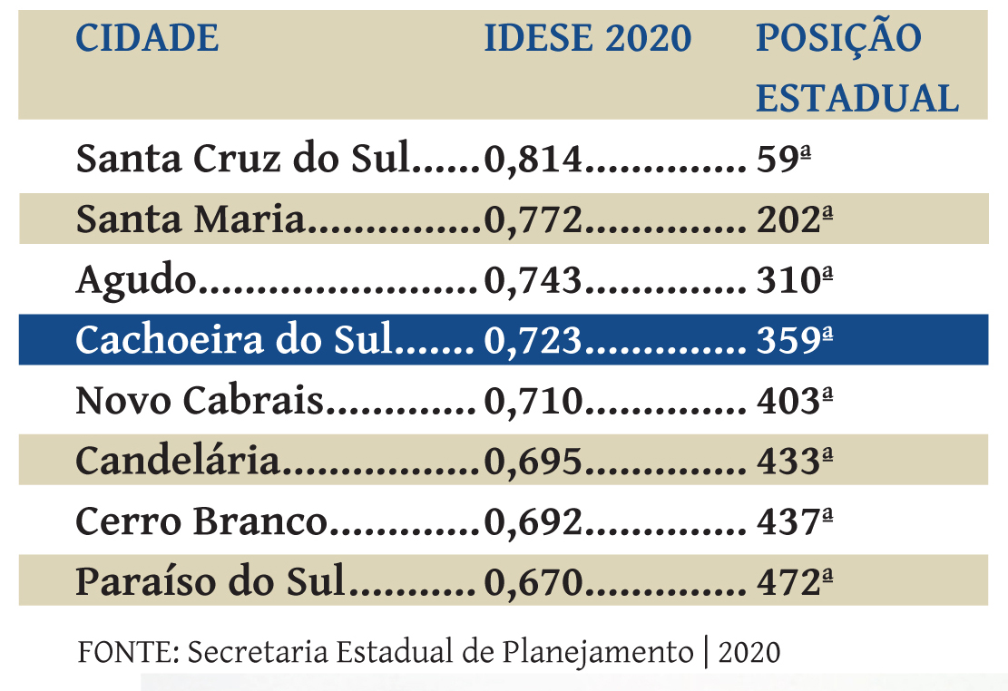 Cachoeira tem, neste momento, um Idese de 0,723 (em uma escala de zero a um). O índice, que em 2019 tinha ficado em 0,726 em Cachoeira, considera três indicadores, educação, saúde e renda, e é calculado pela Secretaria Estadual de Planejamento do Rio Grande do Sul. Significa que Cachoeira está lutando e já ultrapassa 70% da expectativa.