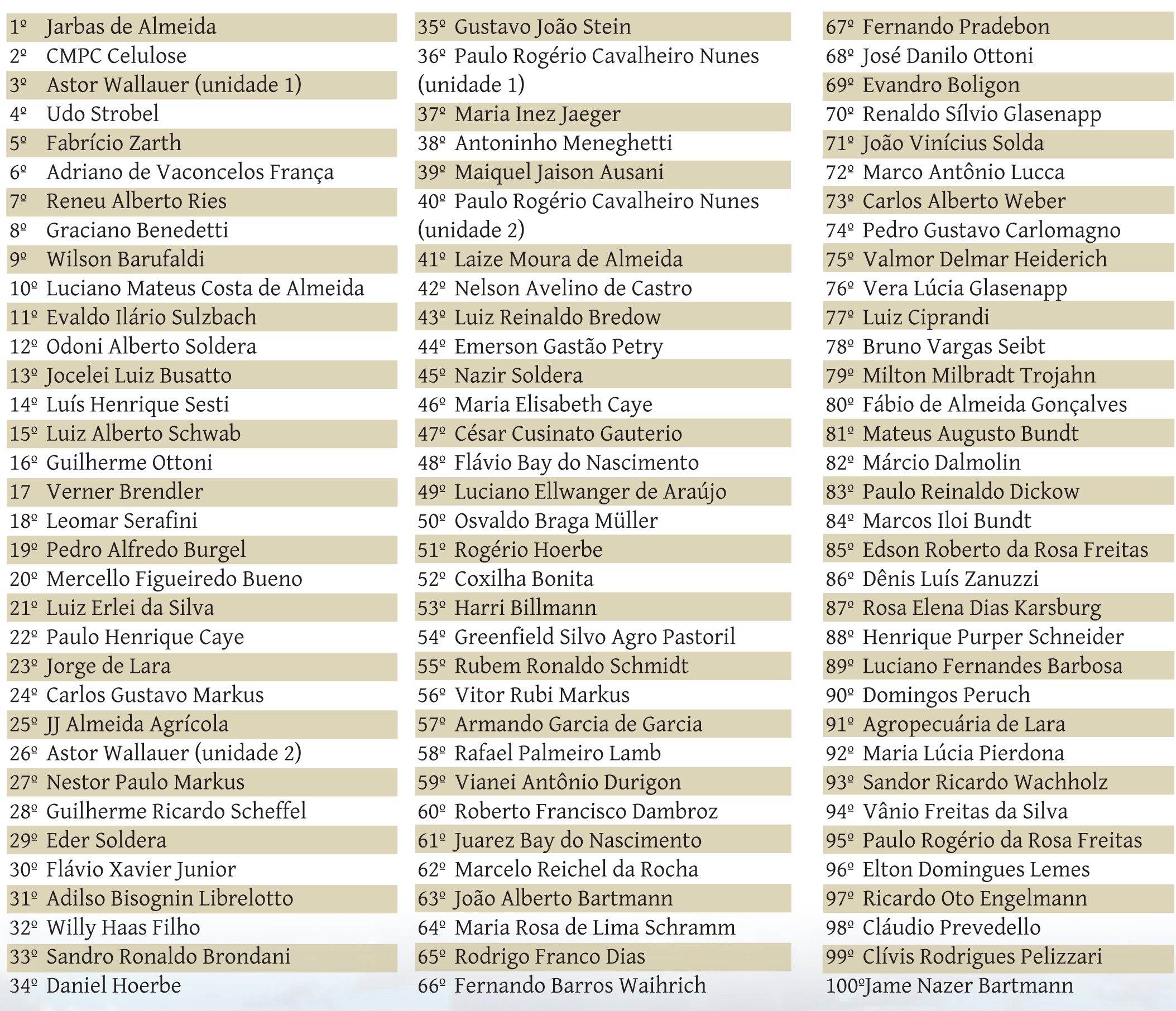 Esse montante gera imposto sobre circulação de mercadorias (ICMS) para os produtores, tributo calculado especialmente como base no Valor Adicionado Fiscal (VAF). O maior VAF agropecuário de 2021 em Cachoeira do Sul foi do produtor rural Jarbas de Almeida. Na sequência, no ranking, aparecem a CMPC Celulose e Astor Wallauer, o primeiro colocado em 2020.