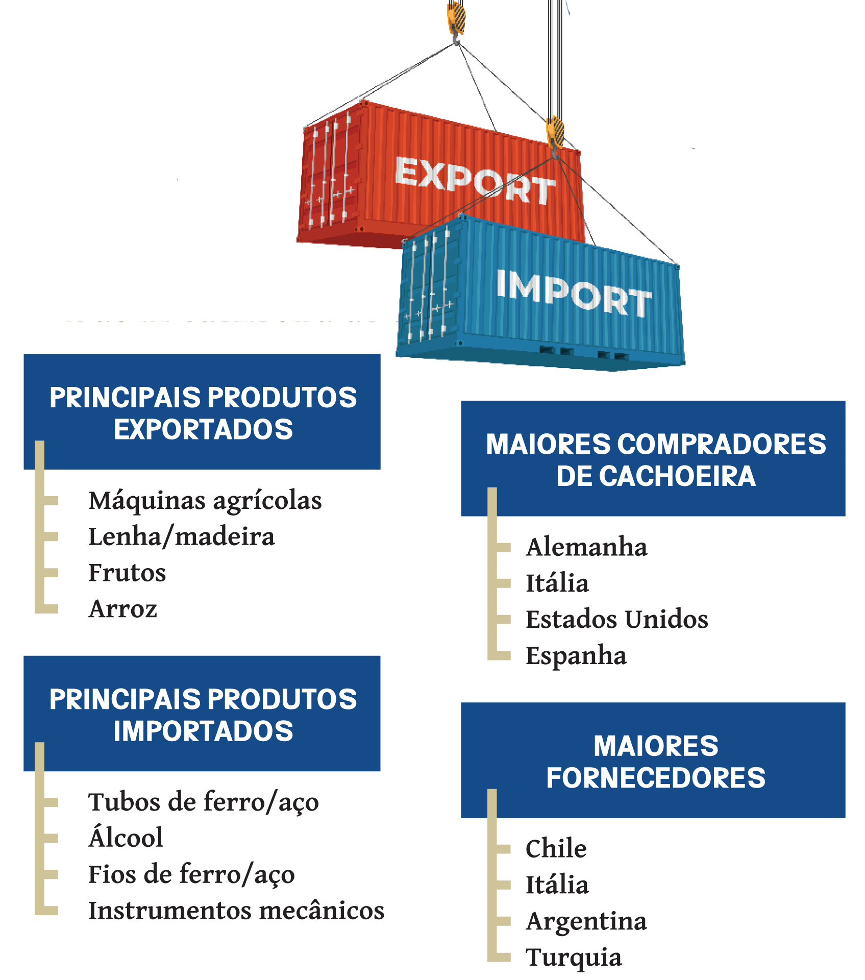 Nas importações, Cachoeira comprou praticamente metade do que havia adquirido de outros países em 2021 – ano em que teve seu maior resultado em volume de produtos adquiridos do exterior desde 2013. A principal matéria-prima importada pela cidade em 2022 foi tubos e fios de ferro e de aço, matéria-prima de indústrias metalmecânicas de Cachoeira, que são as principais responsáveis pelas exportações de máquinas agrícolas.
