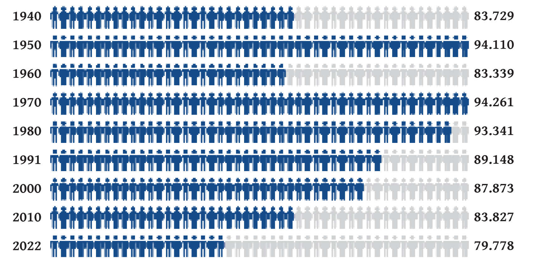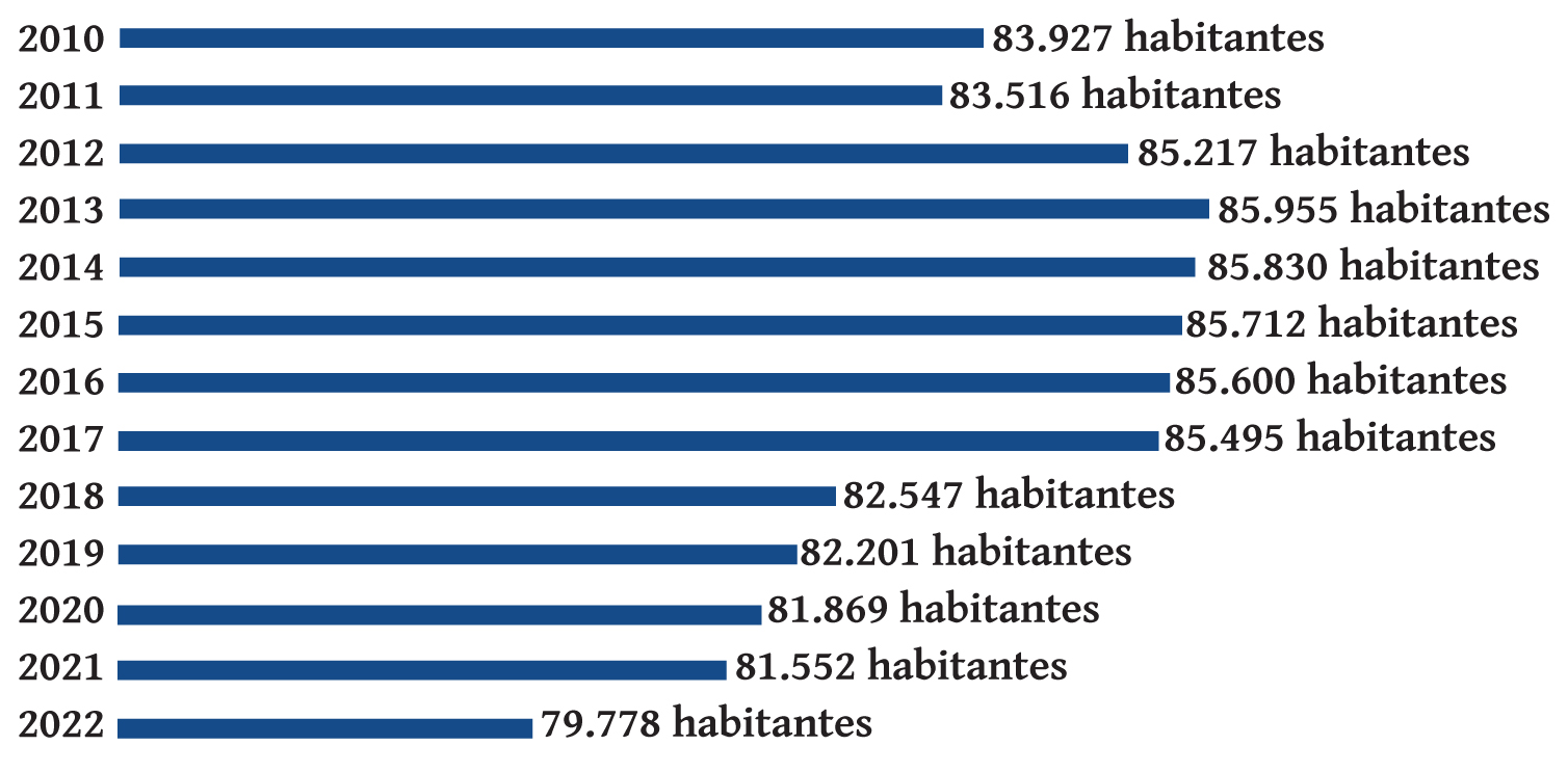 Os dados de 2010 e 2022 são do censo demográfico. Entre 2011 e 2021, o IBGE fez estimativa anual, baseada em dados de nascimento e mortalidade