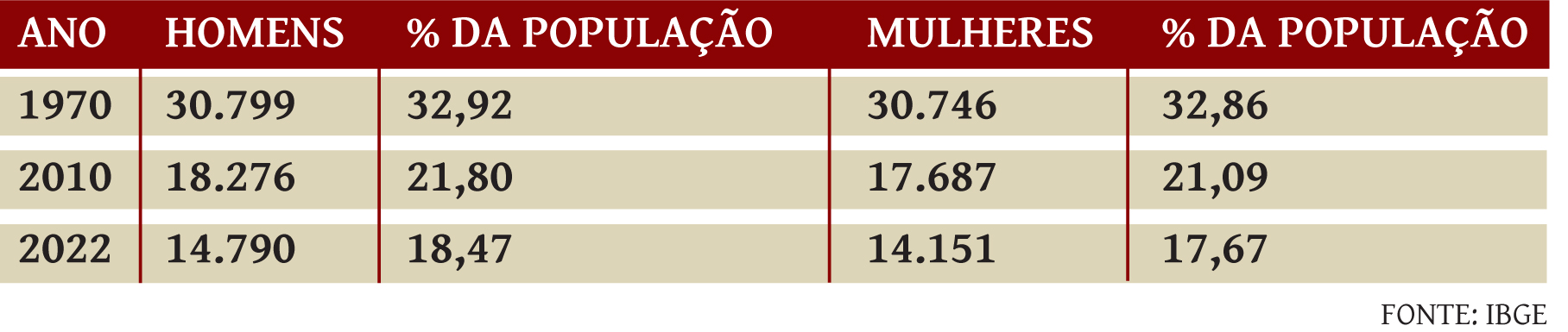 Assim como foi constatado no Brasil, a razão de sexo por grupos etários aponta uma proporção maior de homens desde o nascimento até os 29 anos de idade em Cachoeira do Sul, atesta o Censo Demográfico 2022. A pesquisa do Instituto Brasileiro de Geografia e Estatística mostra que em todas as faixas etárias até os 29 anos de idade, 18,47% são homens e 17,67% são mulheres em um universo de 80.070 habitantes em Cachoeira do Sul. A partir dos 30 anos, elas são a maioria na cidade. Este cenário não é novidade e foi apontado em outros estudos feitos pelo IBGE, como em 1970 e 2010.