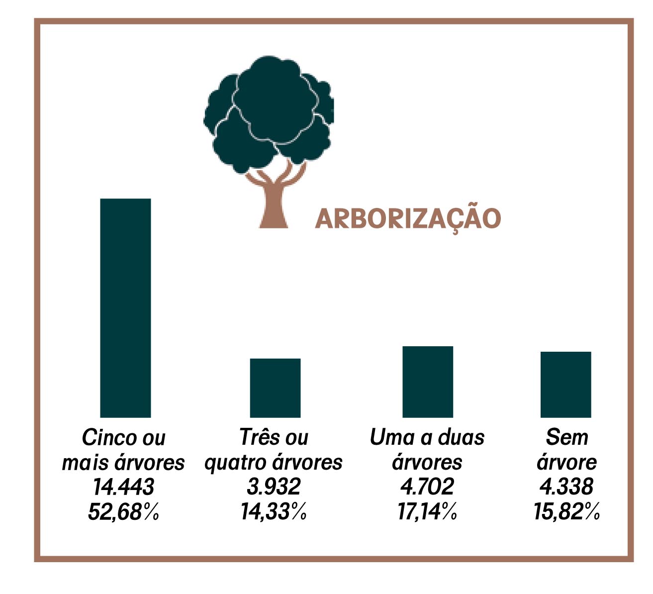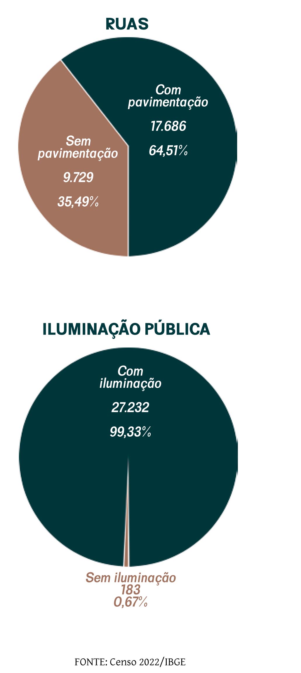 Ainda segundo o IBGE, 99,33% dos domicílios urbanos dispunham de iluminação pública em 2022. Apenas 0,67% dos imóveis estavam em áreas sem o serviço. A pesquisa também avaliou aspectos ambientais do entorno das residências: mais da metade dos domicílios (52,68%) estavam cercados por cinco ou mais árvores, evidenciando um certo grau de arborização nas áreas urbanas da cidade.