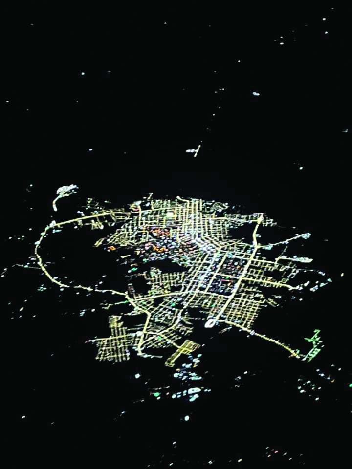 Foto aérea de Cachoeira do Sul à noite dá uma ideia da distribuição urbana do município às margens do Rio Jacuí