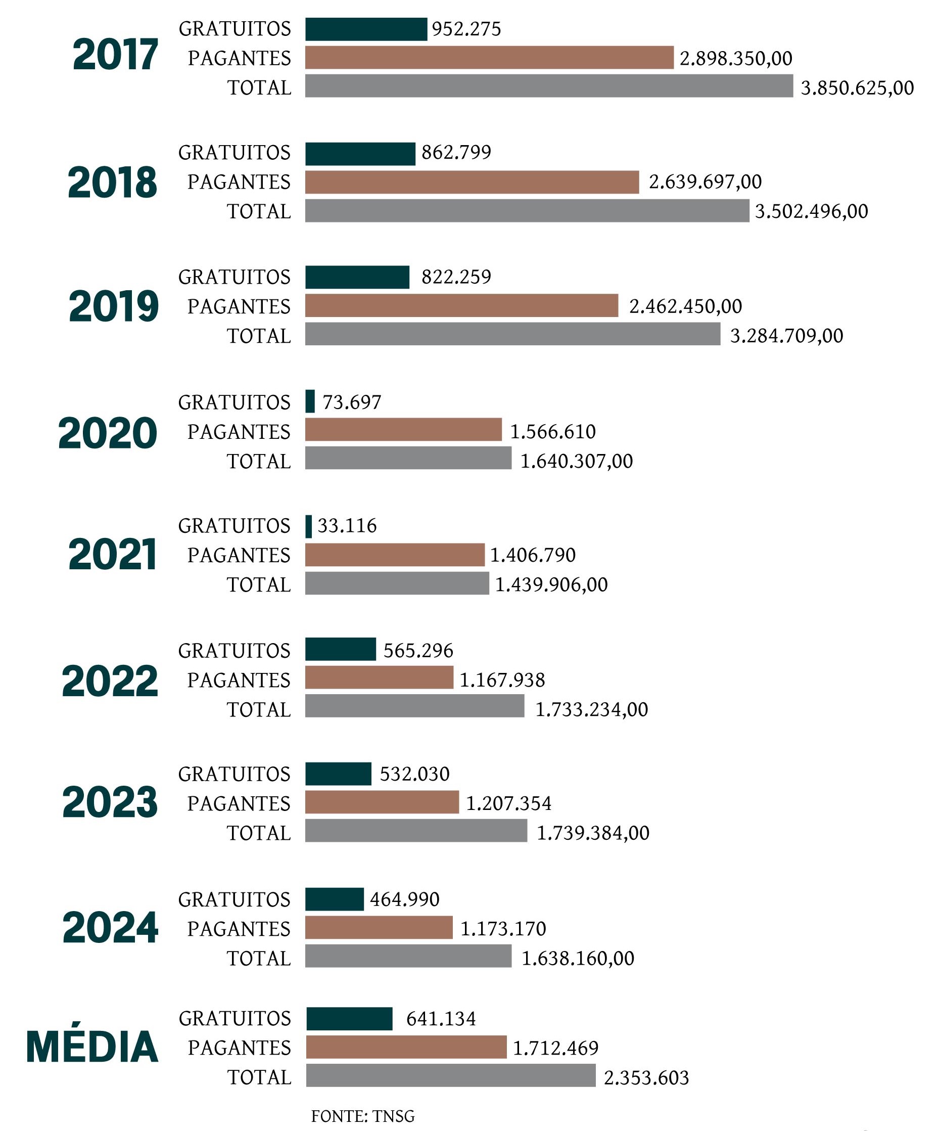 Mais preocupante que a queda no total de passageiros, no entanto, é o encolhimento no número de pagantes: foram, em média, 85 mil passageiros pagantes por mês, uma queda de 11% frente ao ano anterior. Em contrapartida, as gratuidades aumentaram para 47 mil por mês, crescimento de 6,35%. Entre os beneficiados estão idosos a partir de 65 anos, pessoas com deficiência e até dois acompanhantes, policiais e fiscais da Prefeitura. Estudantes têm direito à meia-passagem. Dos 85 mil pagantes, cerca de 38 mil utilizam vale-transporte concedido por empregadores.