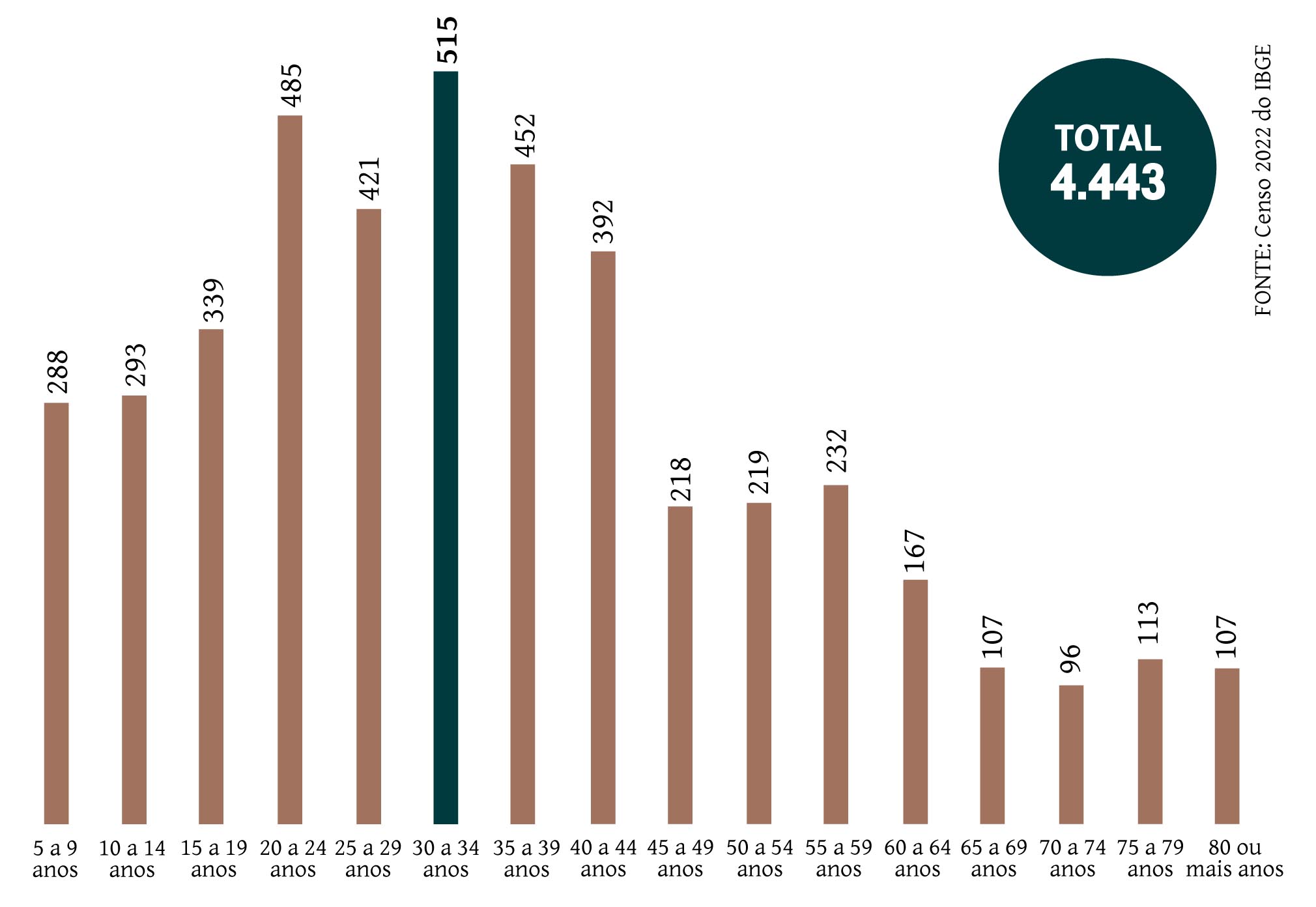 Foram registrados pelo estudo a migração de 2.083 homens e de 2.360 mulheres para Cachoeira no período. A maior parte dos novos moradores, 515, estavam com idade entre 30 e 34 anos no Censo 2022, seguido da faixa de 20 a 24 anos (485) e dos que tinham de 35 a 39 anos (452).