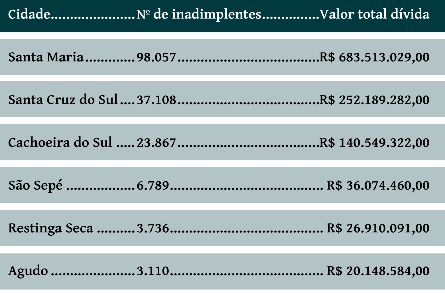 No cenário da Região Central do Rio Grande do Sul, Cachoeira do Sul apresenta um quadro relevante, embora menos crítico que o de Santa Cruz do Sul, que lidera com 37.108 inadimplentes e dívida total de R$ 252,18 milhões. Santa Maria, principal polo regional, tem 98.057 negativados e um passivo de R$ 683,51 milhões.